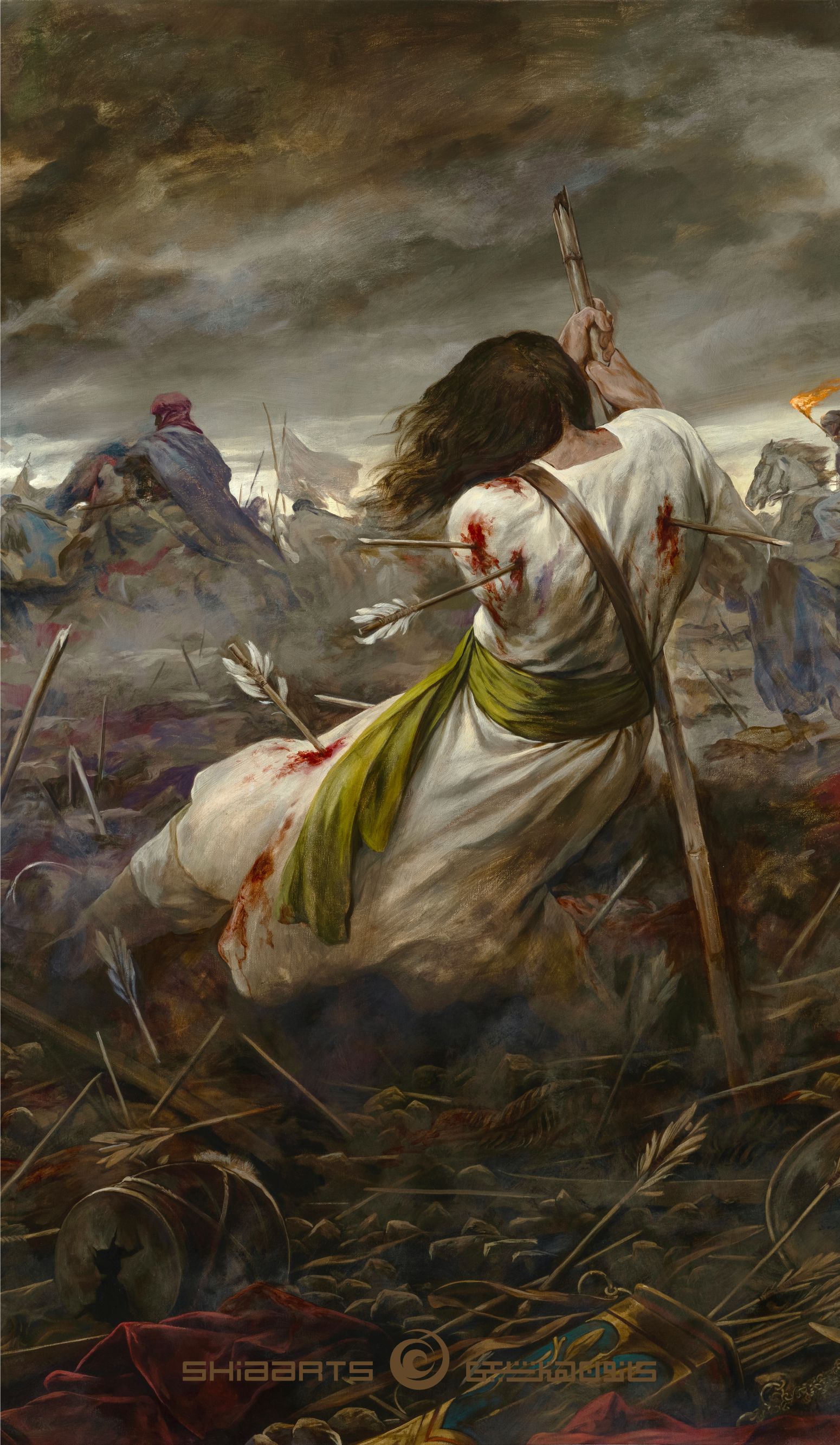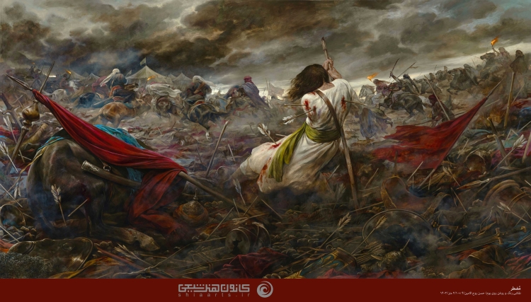 نقاشی رنگ و روغن روی بوم 4 متر در 2/10 متر؛ که نمایی از مبارزه حضرت سیدالشهداء امام حسین (علیه‌السلام) و دقایقی قبل از شهادت ایشان و ایستادگی‌شان در برابر حمله حرامیان به خیمه‌های یاران امام (علیه‌السلام) را به تصویر کشیده